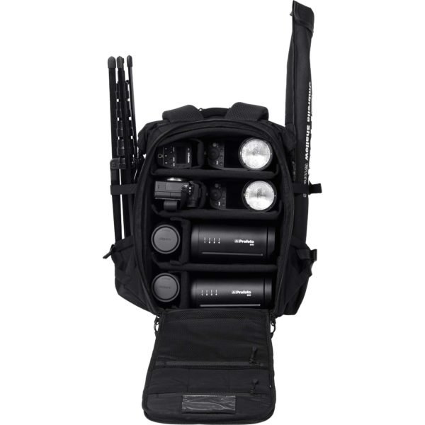 Coge nuestro backpack de alta calidad y viaja lo más cómodo que puedas a tu sesión en localización. Caben dos B10s flashes más accesorios y dos trípodes. Puede usarse también para guardar otras luces y equipamiento fotográfico gracias a los compartimentos ajustables.